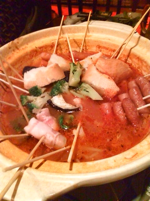 ・串盛り(豚串カツ、粗挽きウインナー、アスパラの肉巻き、ロールキャベツ、ブロッコリー、ナス、バゲット)