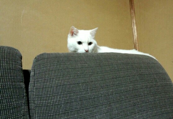 ソファーのうしろに隠れて動向をうかがう2号(^x^)