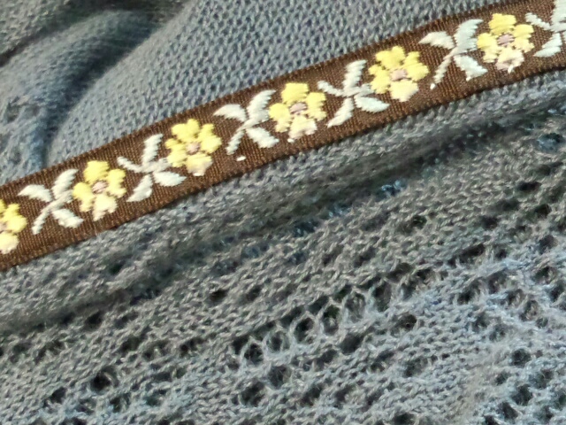 袖口のレースをひっかけてビローンなったカーデガンに、100均のチロリアンテープ縫い付けてみた。