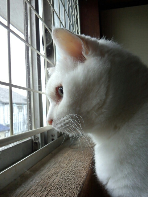 2階の窓から外を監視中の2号(^x^)