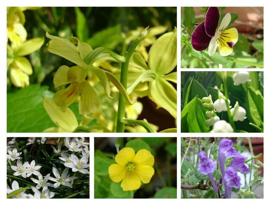 左上から海老根蘭、ビオラ、すずらん、立浪草、カタバミ、オーニソガラム。