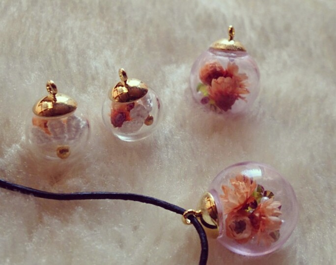 ガラスボールの中にドライフラワーやビーズを入れてみた。