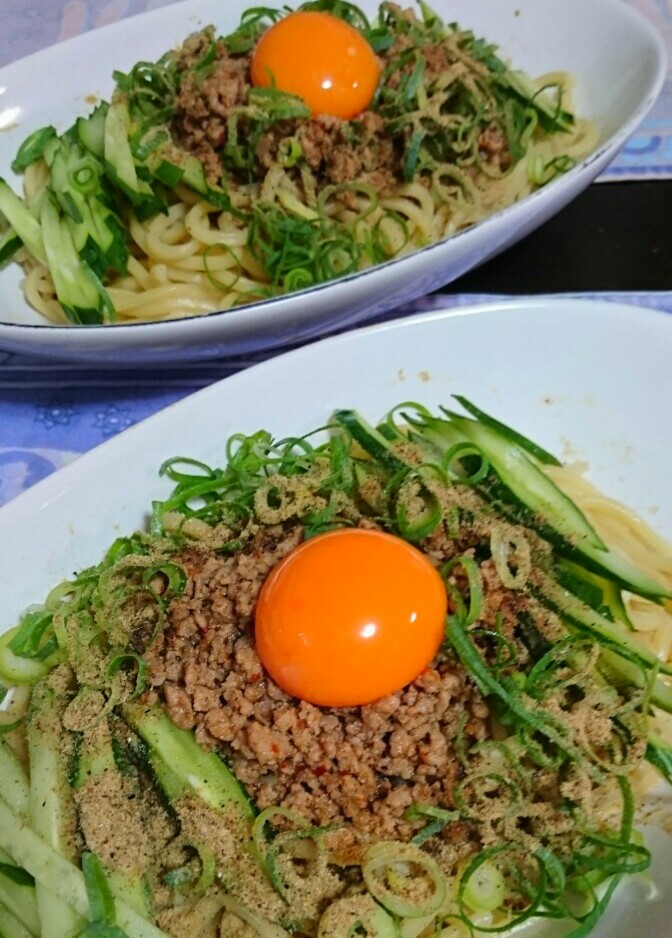極太麺と豚ミンチの辛味噌、刻みネギ、刻みニラ、卵黄、魚粉を混ぜ混ぜして食べる。