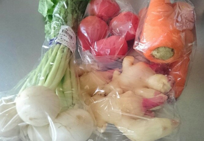 小かぶ➡浅漬け、トマト➡スープ、にんじん➡サラダ、新生姜➡甘酢漬け