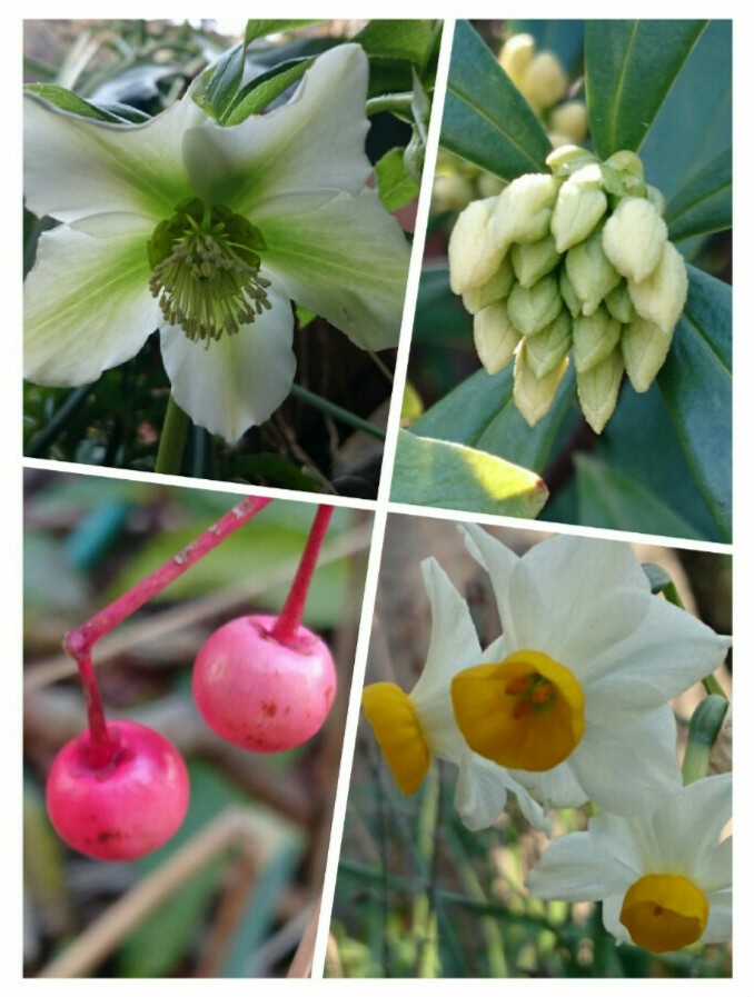左上からクリスマスローズ、沈丁花(白)、水仙、万両の実。