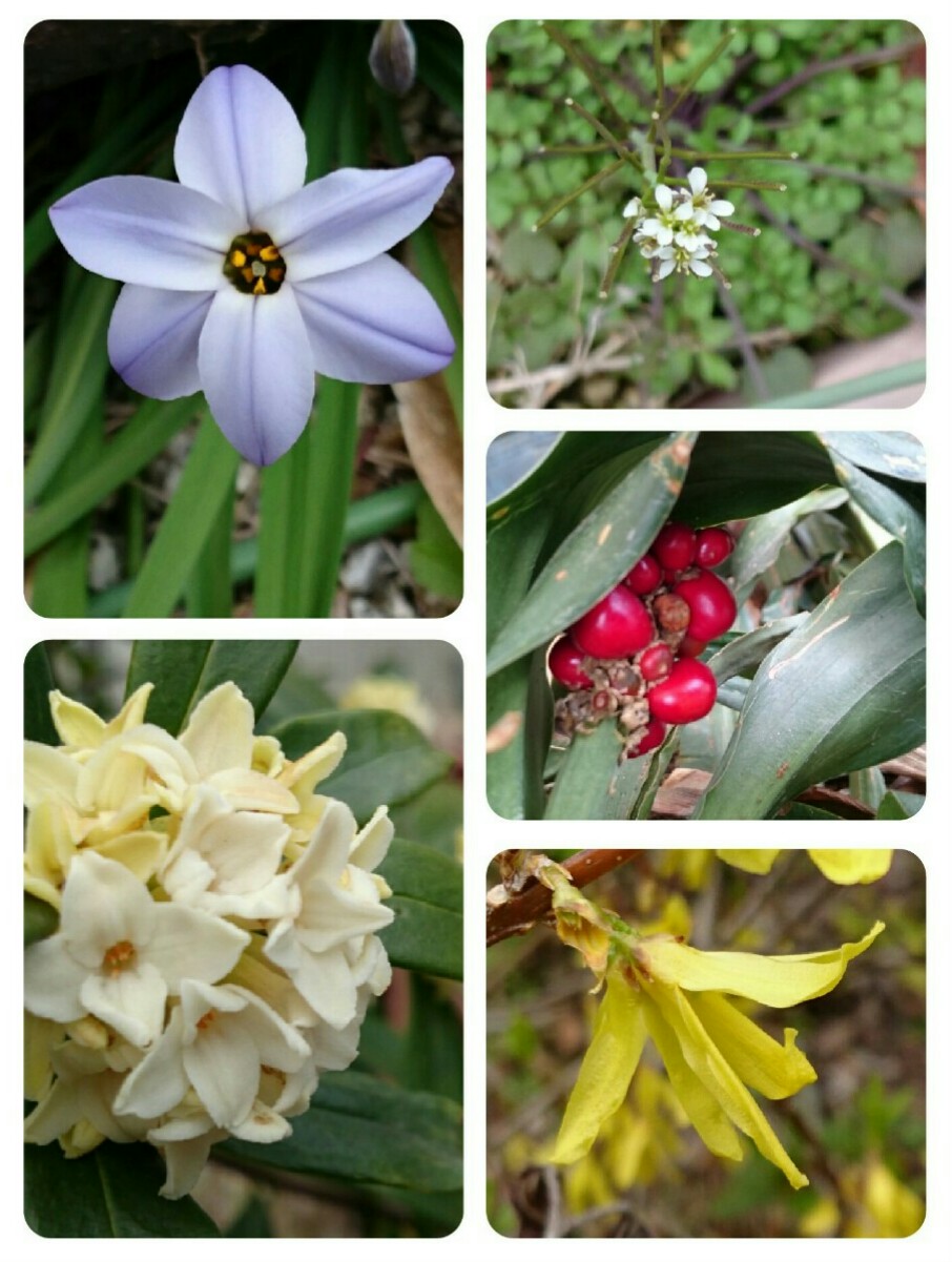 左上から花ニラ、タネツケバナ、万年青、レンギョウ、沈丁花。
