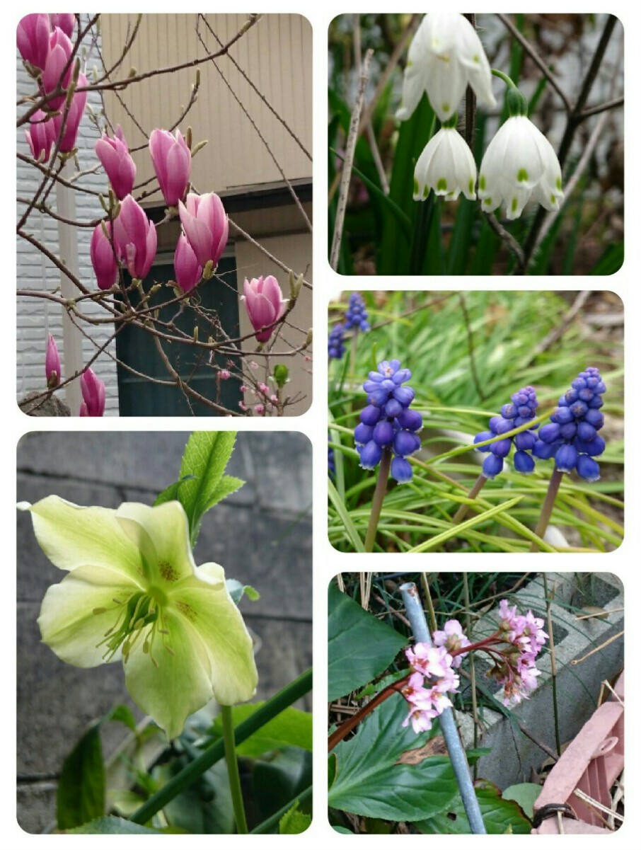 左上からモクレン、鈴蘭水仙、ムスカリ、ヒマラヤユキノシタ、クリスマスローズ。