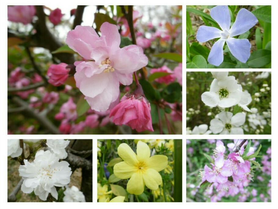 左上から時計回りに、花海棠、つる日日草、?、?、カロライナジャスミン、庭桜。