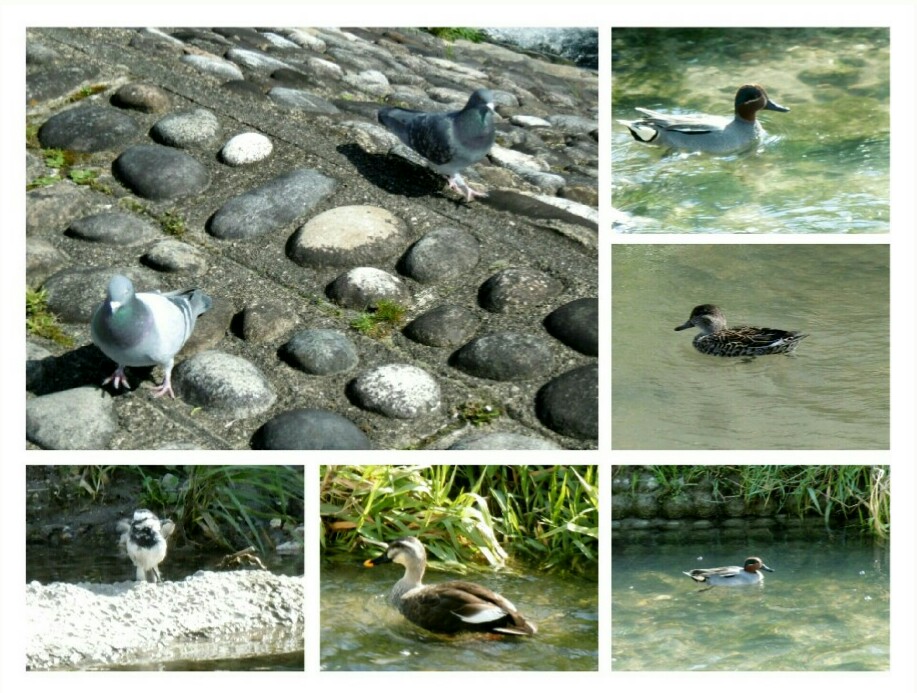 ハト、コガモ、カルガモ、ハクセキレイ。