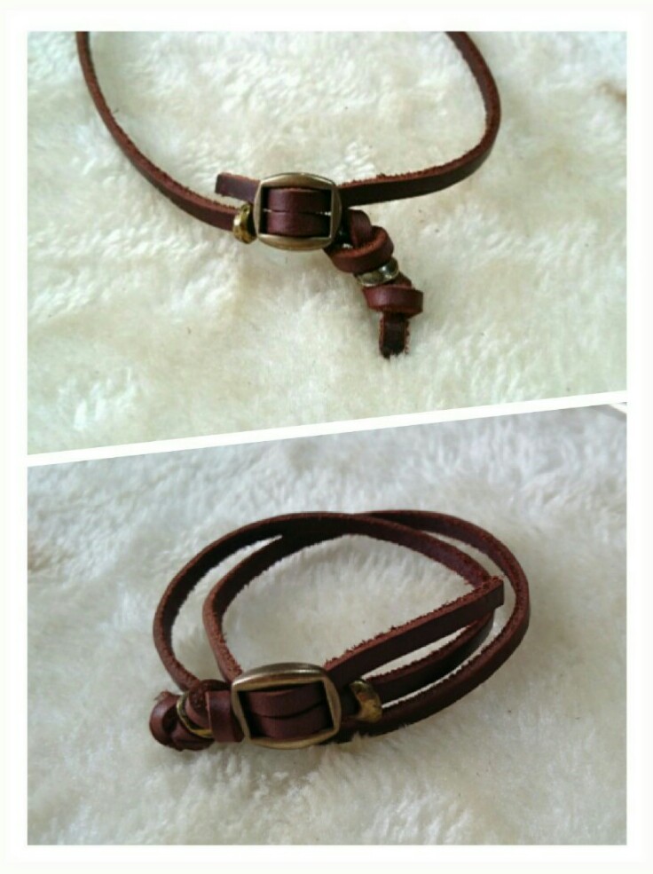 革紐にアンティークゴールドのビーズと金具を組合わせてブレスレットに。