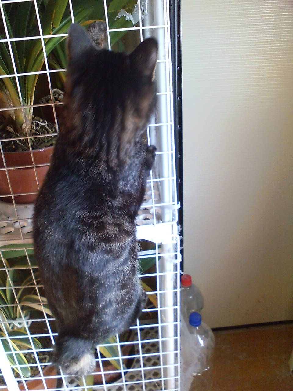 植木鉢の棚によじのぼり中。