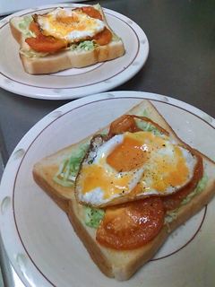 トーストに千切りキャベツと焼きトマトと目玉焼きオンで塩とブラックペッパーふりふり。