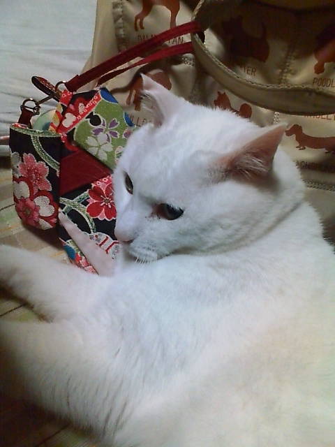 一方2号は母の巾着をまくらに床にでれーん^^