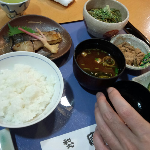 ダンナは焼き魚と茶蕎麦の定食。