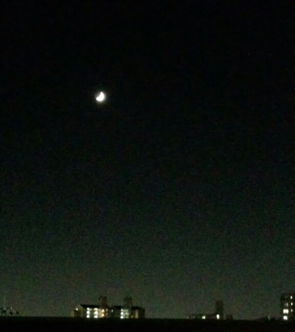 三日月がきれいだなあと思って撮ったんだけど、明るすぎて膨張して写っちゃった(笑)