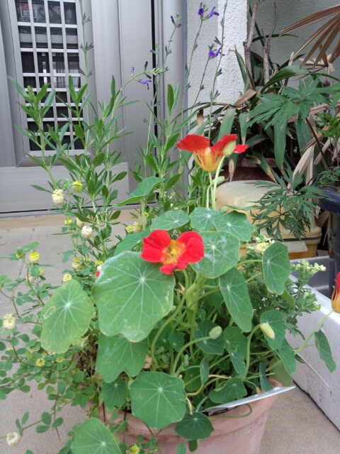 ご近所の園芸仲間さんが玄関先にかざってってくれた寄せ植え。