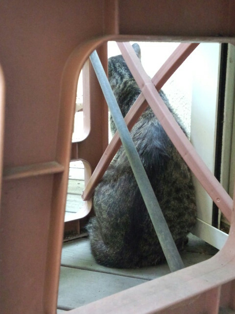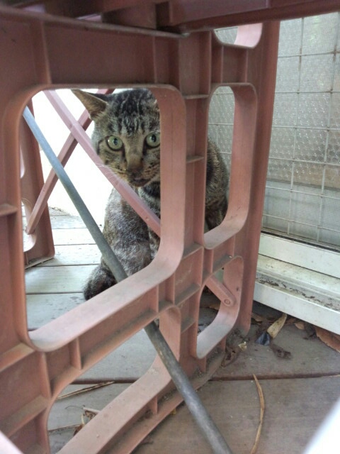 プランターラックの後ろに隠れて水まきから逃げてる外ぬこ2号(^x^)