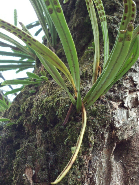 [追記]調べたー。寄生植物じゃなくて着生植物だった。シダの仲間のノキシノブ。乾燥させて煎じて飲むと利尿薬になるんだと。ふーん。葉っぱのウラに2列に並んでる丸いのは胞子嚢。それにしても寒かった!