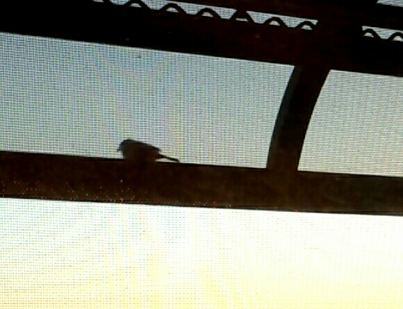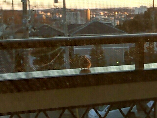 網戸+窓ガラス越しにぼけーっと夕焼けを見てたら、スズメが飛んできた。