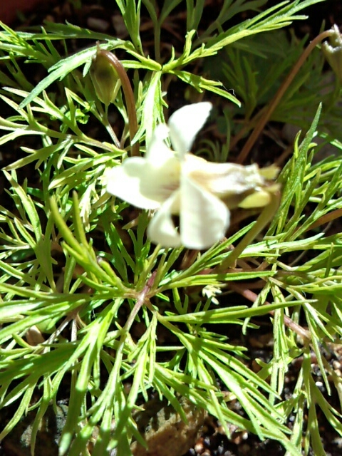 花はスミレのようだけど、葉っぱはイソトマのよう。なんだろう?