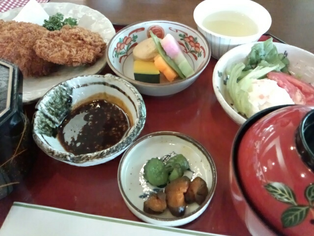 味噌ひれかつ、ポテトサラダ、野菜の炊き合わせ、お吸い物、ごはん。