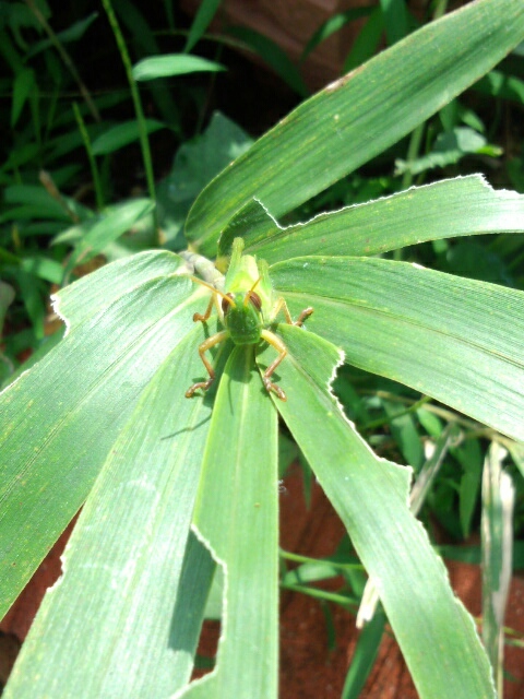 バッタの横を通り過ぎたあとに気づいて振り向いたら、「あ、見つかった」とばかりに慌てて動きを止めるのがおかしい。