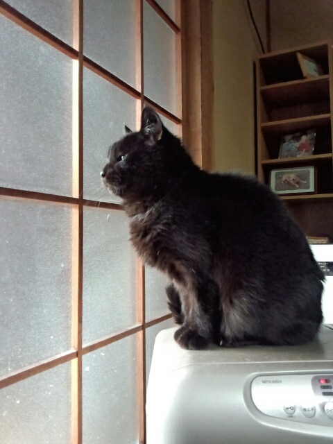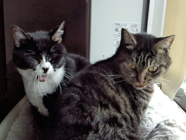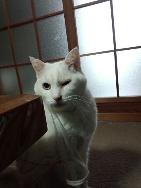 画面右側からファンヒーターの温風がきてるから片目つむっとる2号(^x^)