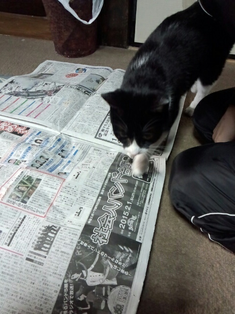 新聞を読むダンナと、お構いなしにスタスタ通る5号(^x^)
