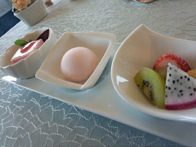 ・デザート(いちごムース、さくらシャーベット、フルーツ)