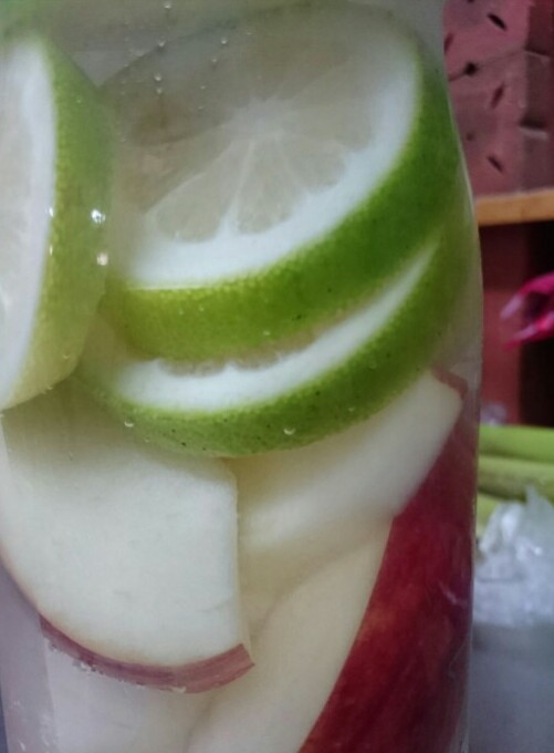 ミネラルウォーターにりんごと青いレモンをぶちこんで半日おいたら出来上がり。