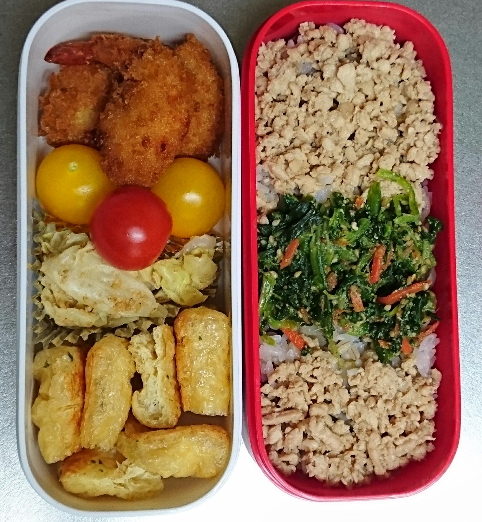 ・鶏そぼろごはん(ごぼう御飯、鶏そぼろ、ほうれん草のごま和え)