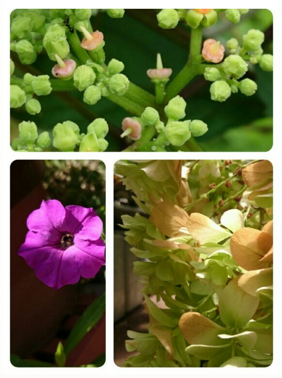時計回りに、藪がらし、柏葉あじさい、サフィニア。