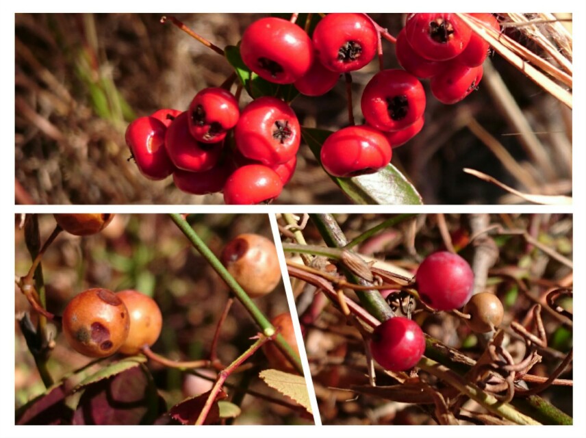ピラカンサスの赤い実と、さるとりいばら(仮)の赤茶の実がきれいだった。